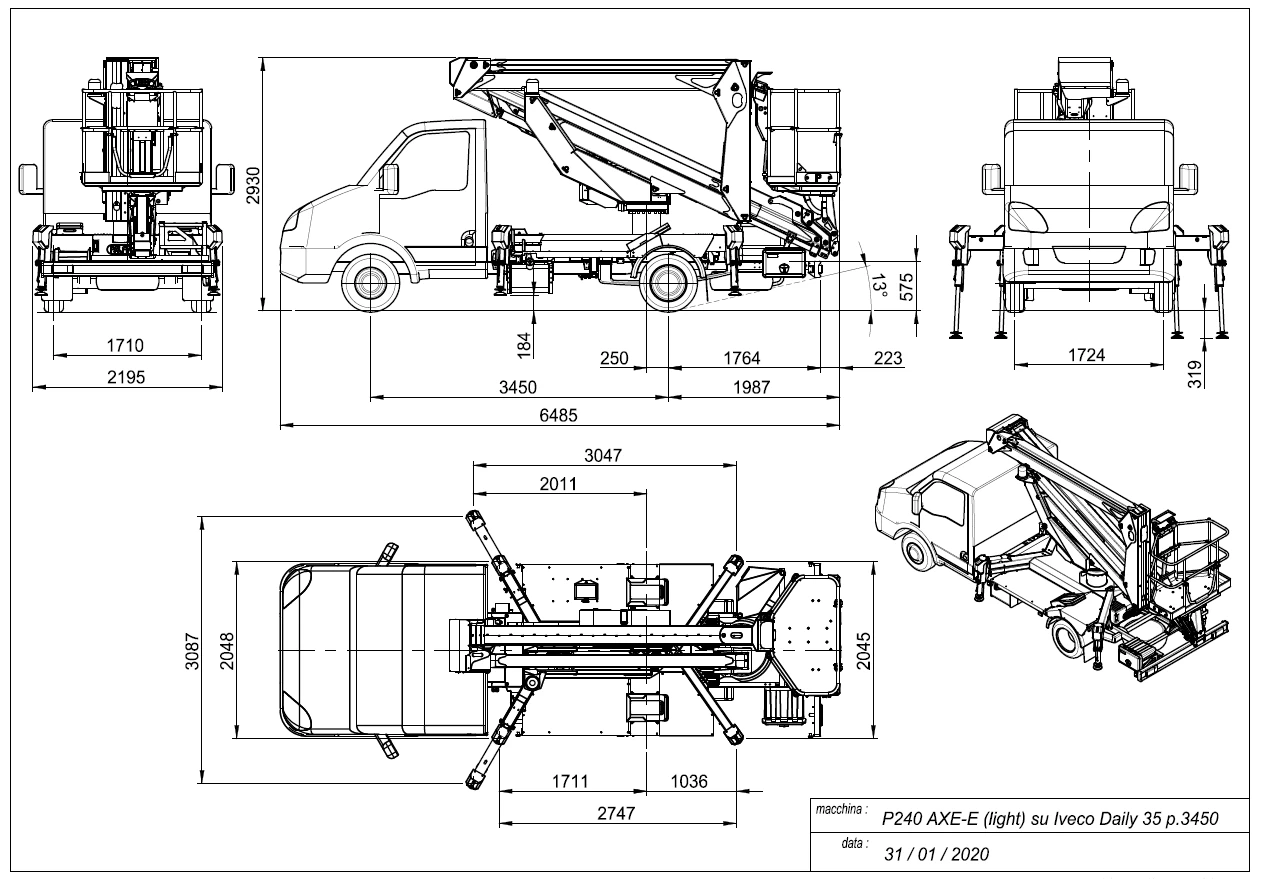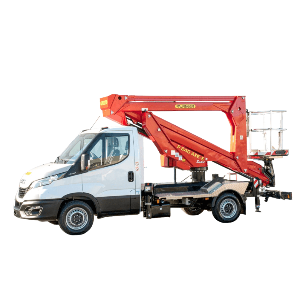 La Palfinger P 240 AXE-E SMART PLUS è la piattaforma aerea doppio articolata su autocarro 3,5 t con patente B, perfetta per interventi urbani e industriali in spazi ristretti. Con altezza di lavoro 22,9 m e sbraccio laterale 11,6 m, il doppio pantografo scavalca ostacoli con facilità, offrendo capacità cestello 250 kg per squadre complete.
